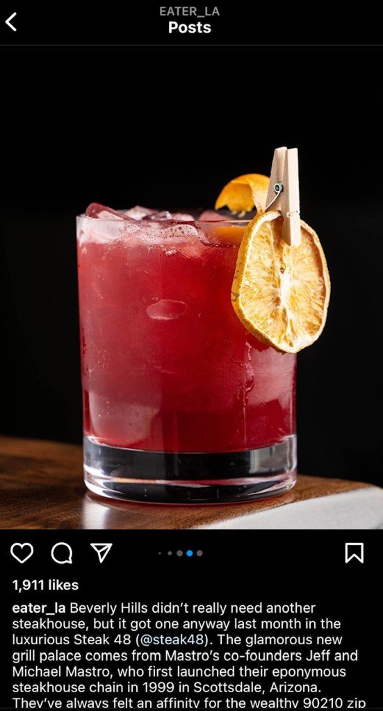 Please, and I’m going to send this one out into the universe…NO MORE GODDAM CLOTHESPINS ON COCKTAILS!!! Please. Pretty please? Pretty please with sugar on top? Scrolling yesterday morning while on the toilet, enjoying the void while voiding, I happened upon an EaterLa post about the new mega Mastro’s Steakhouse in Beverly Hills. As I side swept through the typical snapshots–the interior, a grilled steak, some shrimp–I was instantly triggered by the second to last picture.