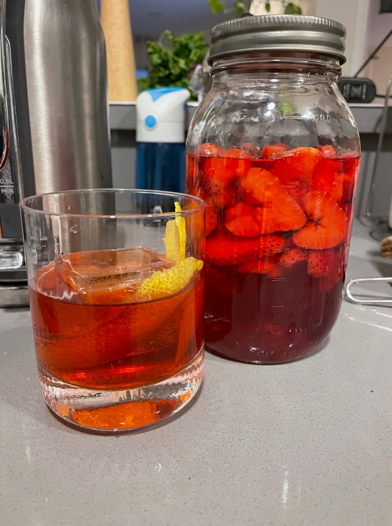 One of the big ones on the block is the old strawberry Negroni trick. There’s very little smoke and mirrors going on here. Simply take some good strawberries and throw them in a jar with a good amount of Campari. No measuring required. In just a few hours it’s worthy. Let it go for a couple of days if you wish. It’s one hell of a parlor trick. I made one of these for Auntie last night and she loved it even though she doesn’t like Negronis. We call that “converting the lost” in the business. When you get some schmuck who has a preconceived notion of a spirit, usually rum, and they taste something that blows their doors off.