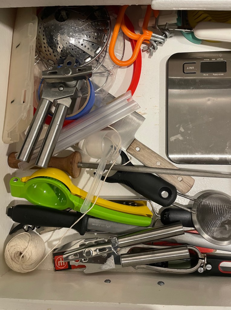 And so yeah, I looked in the junk drawer, always a marvel. Everything in there necessary and simultaneously useless. Two steels, one diamond and one inherited. Two can openers, just in case one goes kaput. You’ve gotta have a back up. There’s some butcher’s twine in there…Can’t remember the last time I used that. The guard my microplane should be in, another more useless grater. Poultry shears. A spare gasket for my pressure cooker. Masking tape, Jo’s old cleaver that’s as dull as a stick, a few other items that just take up space.