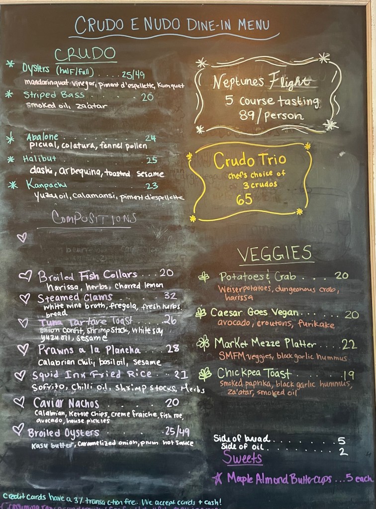First off, I’d like to mention that Crudo e Nudo is a sustainable restaurant business and not just from the perspective of providing overpriced local seafood and organic ingredients to the populace but the owners also treat their employees incredibly well. A few articles have already been written about Crudo e Nudo’s business model, what they do for their employees, and how it all came together with a dash of luck. Read more about it here.