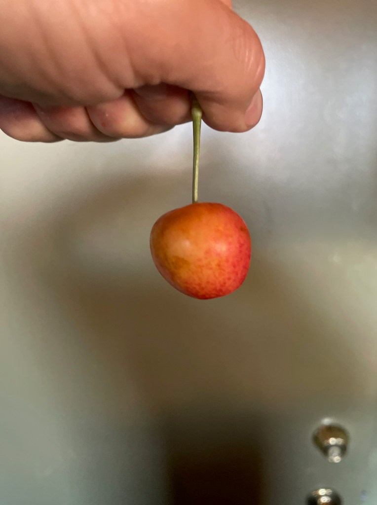Someone forgot to take a picture of all their piles of farmer’s market loot yesterday…So I just took one weak ass snap of a Rainer cherry…Whatever…I pulled a good amount yesterday out of ’em yesterday. I’ve smartened up and started taking a backpack in there. Started off with six green melons from Weiser Farms, one of which I forgot there because my son was going ballistic while I tried to select and pay. Yeah, taking a nearly three year old to the farmer’s market is almost never a joy. It’s a bit like watching the movie Hurt Locker where you’re tense and white knuckling your movie seat because a bomb could go off at any moment. That’s exactly how it feels. I have one eye glued to him while we wander and the other eye scanning for produce. At any second he can decide to veer into an alleyway or behind one of the stands. He thinks any round fruit is a ball and thus if he reaches up and snatches a peach or plum can launch it at an unsuspecting passerby…