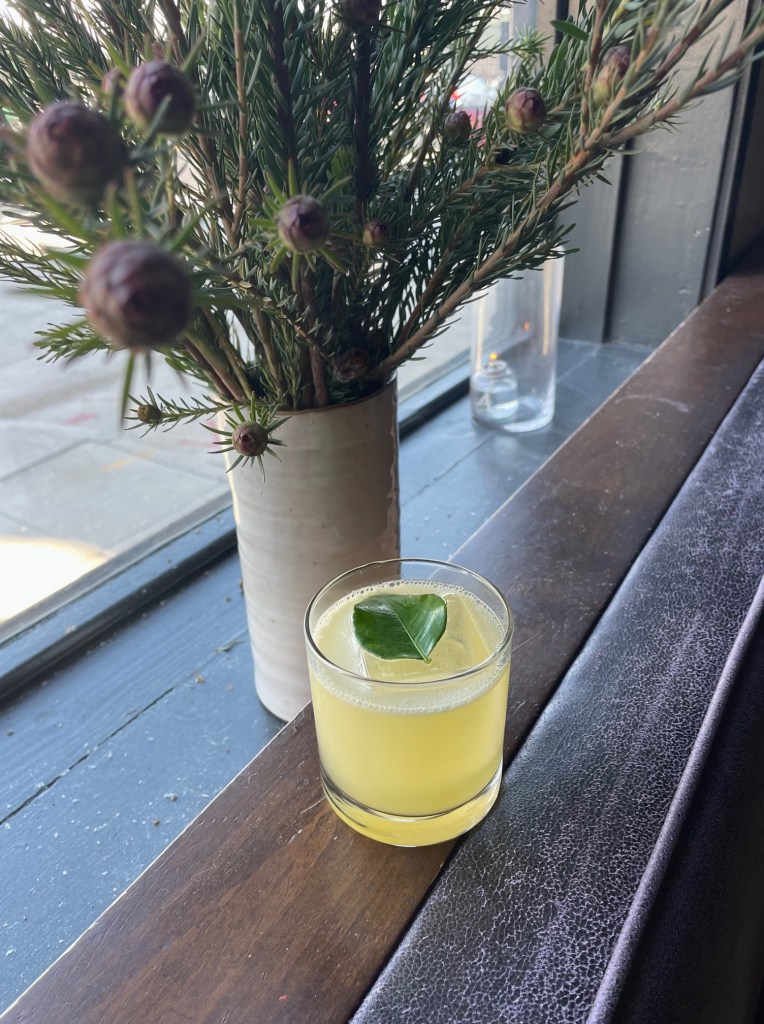 Shake, strain onto BFR. Garnish with a pre-slapped makrut lime leaf for aroma.