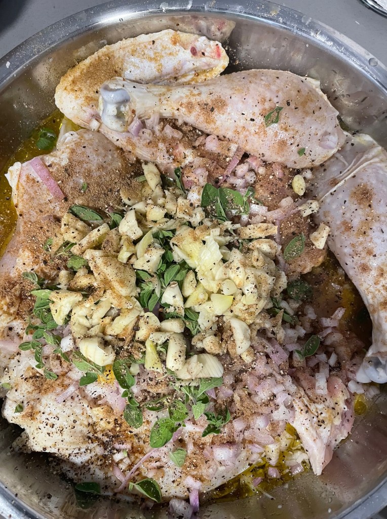 Once you have your chicken sections all ready to go, salt both sides of all the pieces and let them sit for about twenty minutes, then add the other dried spices to both sides. You know the pepper, cumin, and coriander. Transfer everything to a large bowl and add everything else. Cut the shallots and garlic as fine as you wish. I just take the stems off the oregano. I recommend a hand juicer for the citrus. You’ll need just a splash of the soy and even less of the apple cider vinegar. If I was put to gunpoint, I’d say a quarter cup of soy and a tablespoon of the apple cider vinegar. Use about a half cup of olive oil. It should look like this: