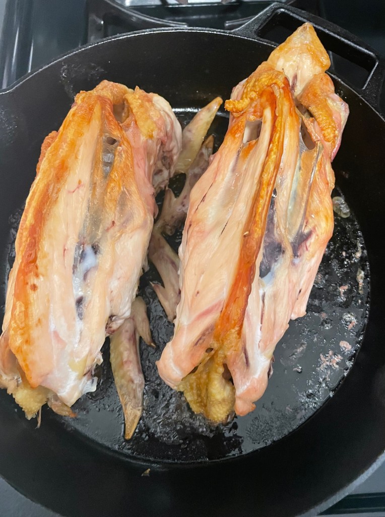 You’ll notice the skin isn’t crispy. A typical mojo won’t have crispy skin, but that’s why Daddy’s Chicken Mojo is special. I take the boney bits and throw them into the trusty air fryer for ten minutes at 425.