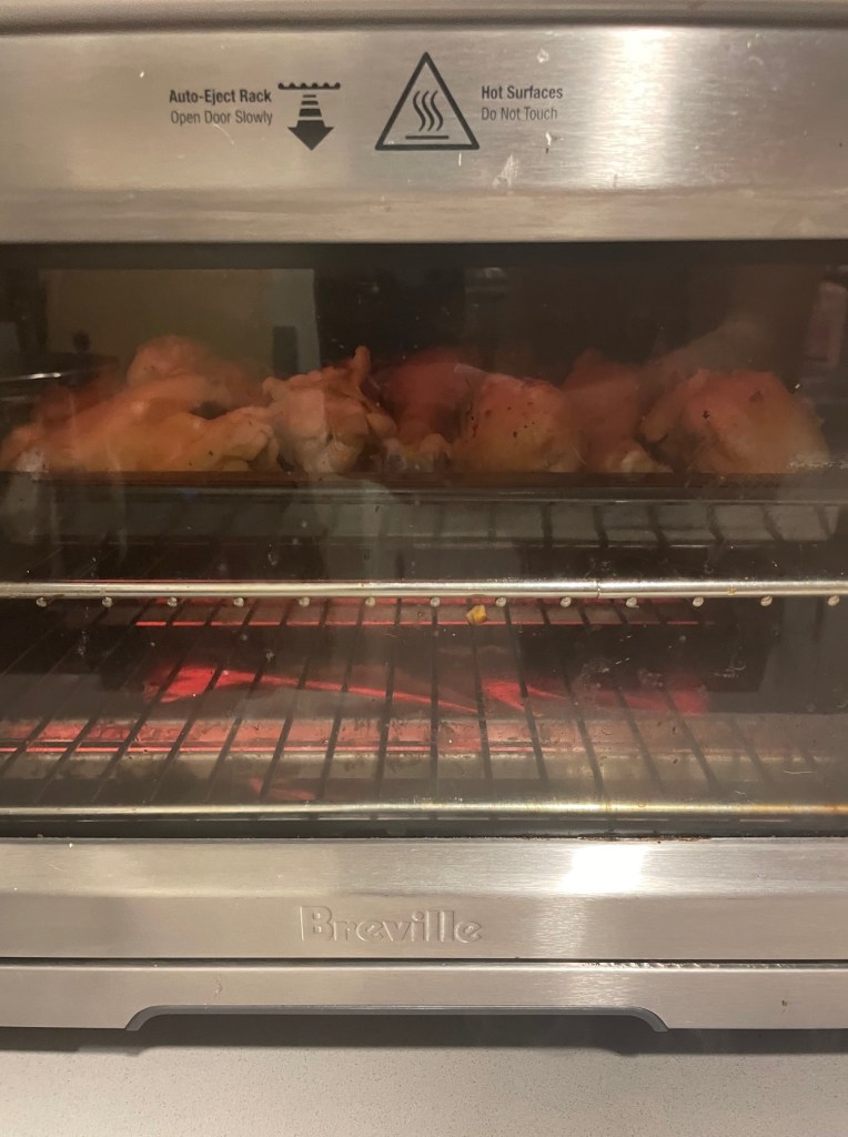 Cut your chicken up, buttercup. You should have eight pieces from each chicken–two breasts, two thighs, two legs, and two wings. You’ll be left with the main carcass and the two wings tips if you do it right. Throw the carcasses in the oven right away at 375. You may ask why I don’t jack the heat a bit and the answer is because it turns my apartment into a goddam furnace even with central air.