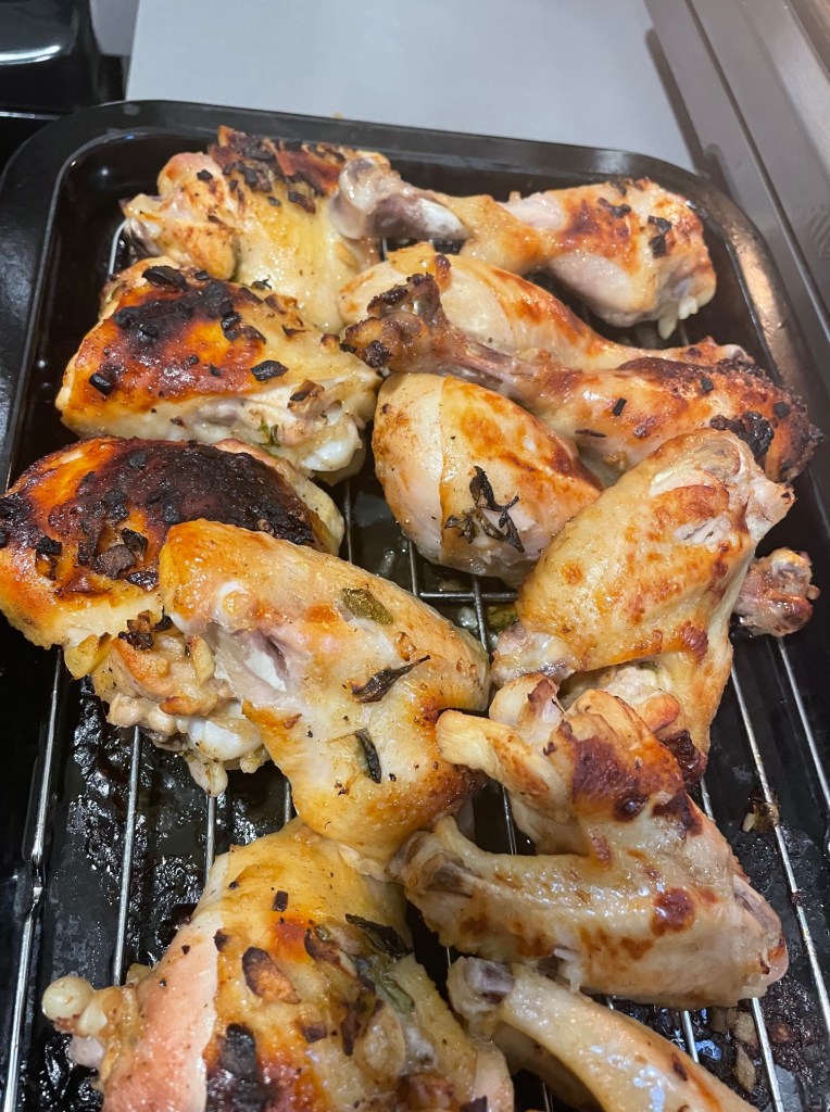 At any rate, after the chicken is done marinating, throw it in the oven. I separate the breasts and the boney bits into two pans because Jo likes the breasts cooked to oblivion and I don’t care for the breasts anyway. I go 375 for thirty five minutes. It’ll look like this when it’s finished: