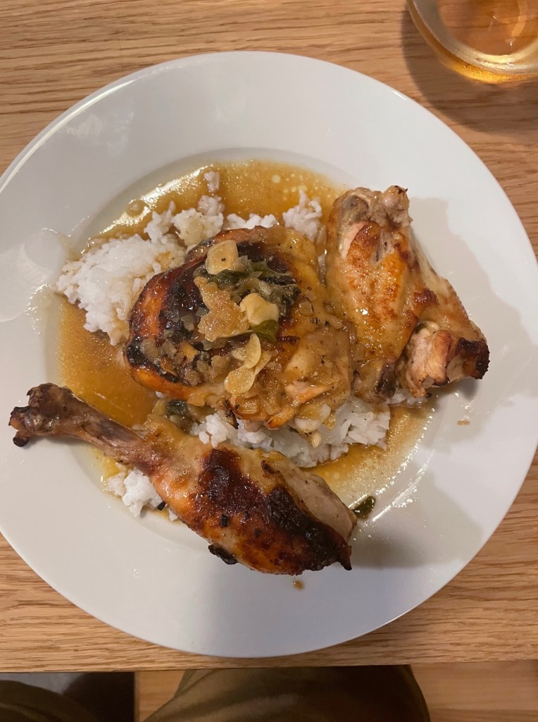 I served it with rice last night and nothing else. No vegetables. I got lazy. I’ve got to say, the sauce is drinkable. It’s so good. It’s because the chicken bones leech out all their goodness as it’s all coming together. We (me, Jo, Nana, Titi) had this with a little Bonny Doon orange wine (on sale at Whole Foods last week) and it was a perfect pairing.