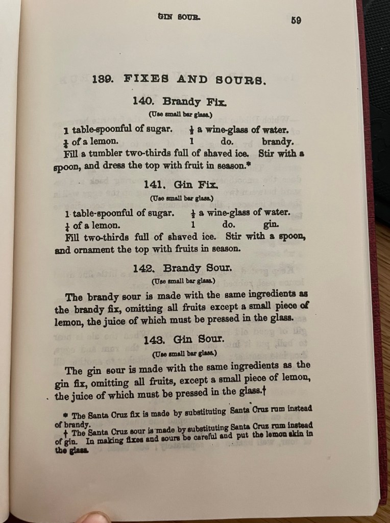 Lot’s of work here. I went straight to the book from 1900, Harry Johnson’s Bartenders’ Manual or How to Mix Drinks in the Present Style. First off, ha, Harry Johnson. Yes, he’s got a whiskey sour recipe. Yes, it’s real weird. No, there’s no egg white in it and finally, no, there’s no mention of a Boston sour anywhere. The book is pretty cool to read however, and has chapters in the beginning like “How a Bartender May Obtain a Situation.” It’s worth a look.