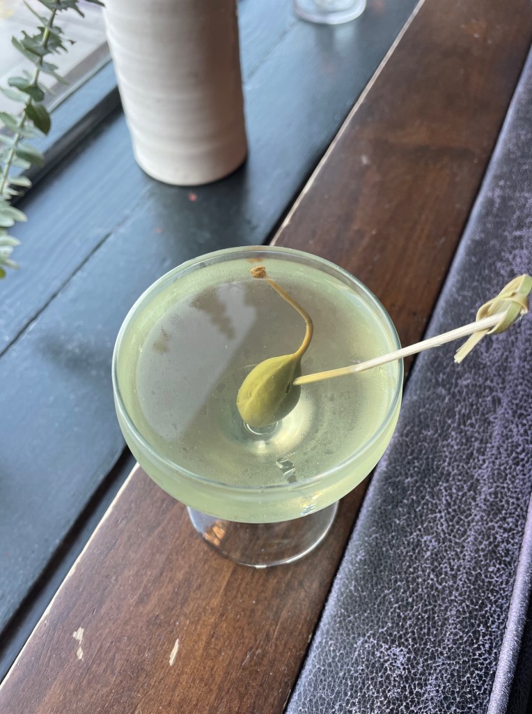 Chef Fox put a cool tomato salad on the menu with different types of capers, one of them being these big berries, almost fig like with the chewy, snappy seeds inside. It got me thinking about two things: One, a Gibson. Love a Gibson. It was one of the first cocktails I ever got around to really enjoying and making well even though at the time I had no idea what I was doing. This was in the New York days when I worked lunches and afterward we’d start in on the Hendricks. In the stifling and miserable days of New York summers it was mostly salty dogs made with a jug of Simply Grapefruit purchased from the bodega across the street. In the fall, I whipped up Tom Collins for all of us (so good and simple) and the winter months were dominated by the Gibson. Yum.