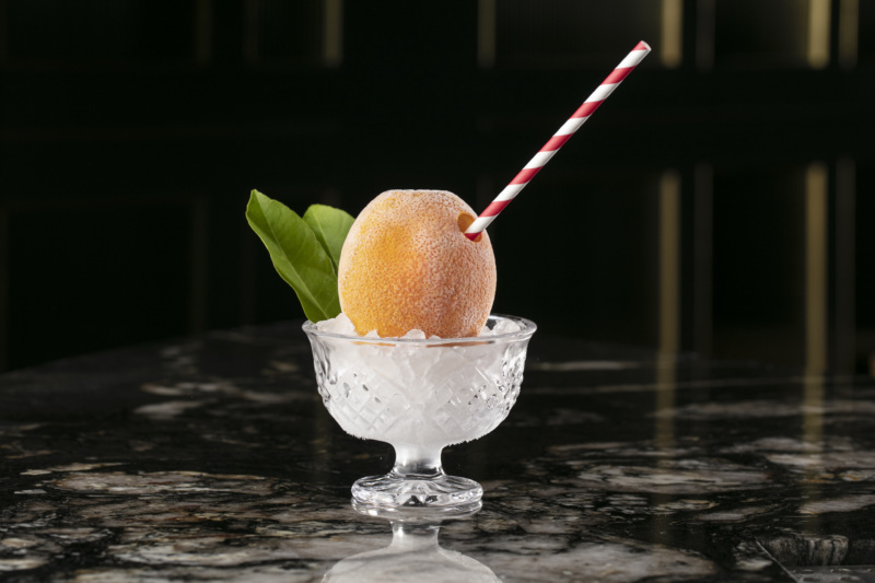 The cocktail inside the orange vessel is equally complex. The base is a housemade orange liqueur blending Haku vodka, Grand Marnier, orange peels and dextrose (an artificial sweetener commonly used in foods), which gets added to a bag and macerated with slices of orange under a vacuum. The technique, known as vacuum maceration, uses the change in atmospheric pressure to boil the liquid at room temperature, retaining the integrity of the ingredients to get the flavor of the fruit without overdiluting the liqueur. He uses the same method to combine Toki whisky, tropical mangoes and glucose into an ingredient that adds structure to the drink, lending a mouthfeel that he says mimics that of orange pulp.