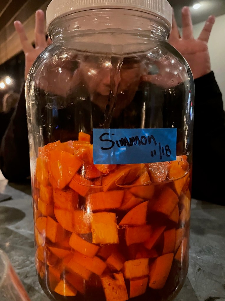 That’s about it. This works with several different fruits, not just persimmon. Plums come to mind which is where the idea originated. I haven’t tried it with anything else that I can remember off the top of my head. I think whatever you choose has to make some salt sense. Think about the classics. Once you’ve got it all inside your jug, let it sit for a couple of days to allow everything to incorporate, then puree it with your trusty stick blender and let it sit another day. On day four, strain it all but don’t throw away the scraps. Take the waste and throw it all in a jar with neutral spirit. Let that sit another couple of days, strain, add simple syrup (or your salted persimmon honey), and voila, you now have persimmon liqueur.