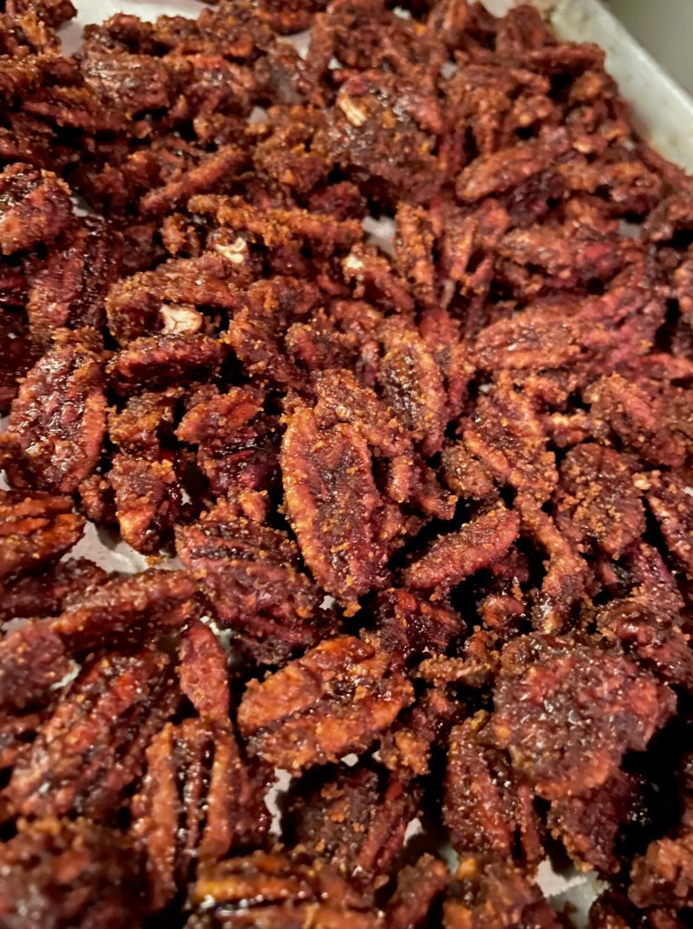 Boil it down, down, down until it’s nice and syrupy then throw those nuts in there and give it all a stir. You’ll know when. It’ll coat those nuts nice and pretty. Strain ’em off and throw ’em back in the pan sans syrup, no heat! Just utilize the pan as an already dirty vessel pre-seasoned with all the choice flavors. Add a good handful of the same sugar, a nice big pinch of salt…Stir, stir, stir…Put ’em on a pan to cool. Done…Yum, yum, yum…