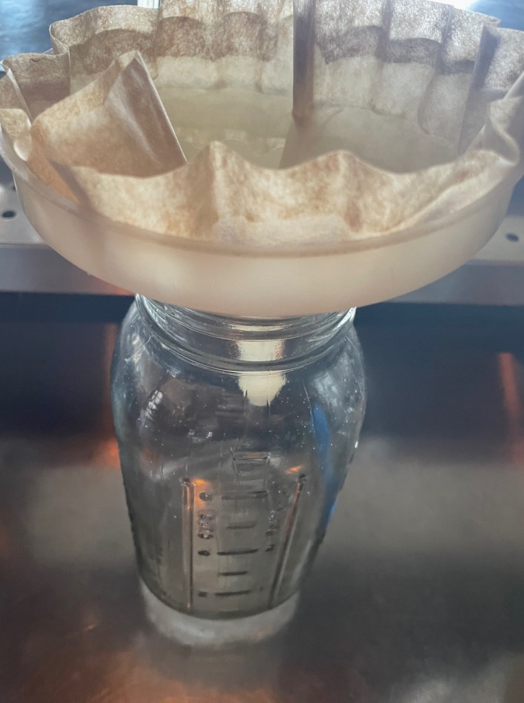 I don’t know what kind of white chocolate we buy. I stole it from pastry. Little white disks. Your mileage will certainly vary with the type you use. The cool part is you can keep reusing the white choc after you strain the tequila off. Once the “washed” tequila is separate, pass it through a coffee filter. The infusion process only saps about 10-20 grams away, so you can just keep adding to it when you want to go again. For any home bartenders you probably don’t have to worry about this.