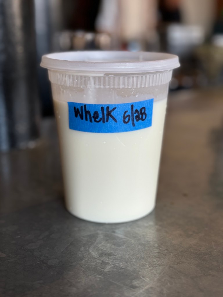 No, not Lawrence Welk, you ninny. Whelk, as in 1 part whey and 1 part condensed milk. Our kitchen makes a lot of fresh cheese so we’ve always got plenty of whey hanging around and waiting for something to happen. The other part of the equation, condensed milk really needs no introduction. It’s a gift from the gods it is. What is it though? It’s just milk (yum) with no water and a fuck ton of sugar making it sort of unbreakable. Yeah, that means go ahead and shake it up with citrus. A bit of a game changer if you ask me. And if you ask me again, I’ll talk about how adding dairy to a cocktail is just next level. It’s why when you were at T.G.I.Fridays with your parents as a kid and you took a sip of their mudslide and fell into a spell of giggles and satiety. It’s why chefs put butter in everything and it’s why vegan desserts tastes like ass for the most part. Or maybe it’s why vegans are so disgruntled all the time, just give them some damn cheese already.