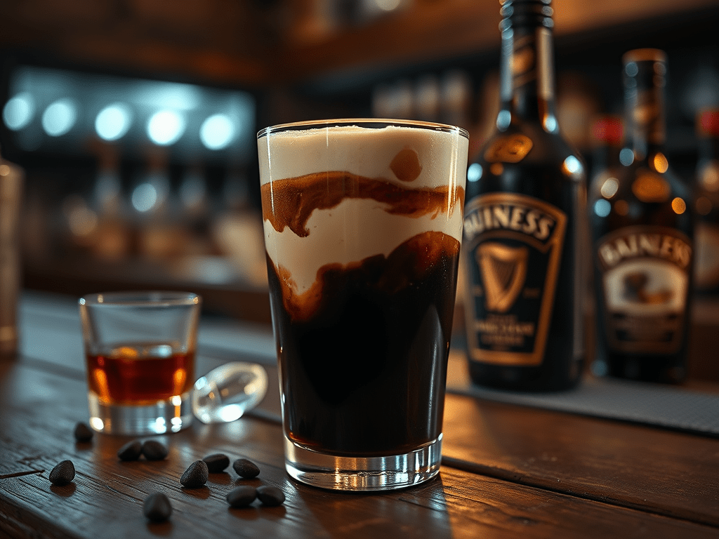 Shake and pour over crushed ice inside a rocks glass half full of stout