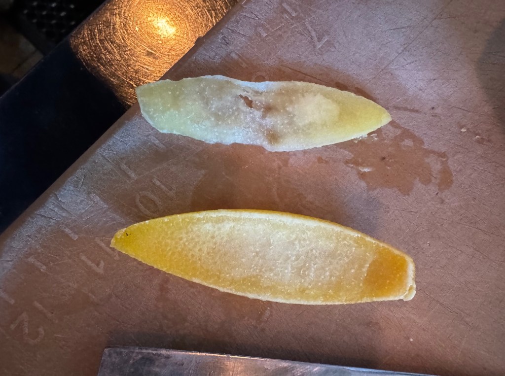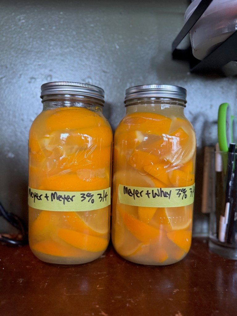 I did two of these. One with whey and one with Meyer lemon juice. Both at 3% salt. The whey came out pretty good too but I screwed up one main component because I got lazy. I didn’t cut the pith out and I should have. This made the fermented whey Meyer lemon sherbet a little too bitter in my opinion. Not too bitter, mind you, but enough to make it too weird.