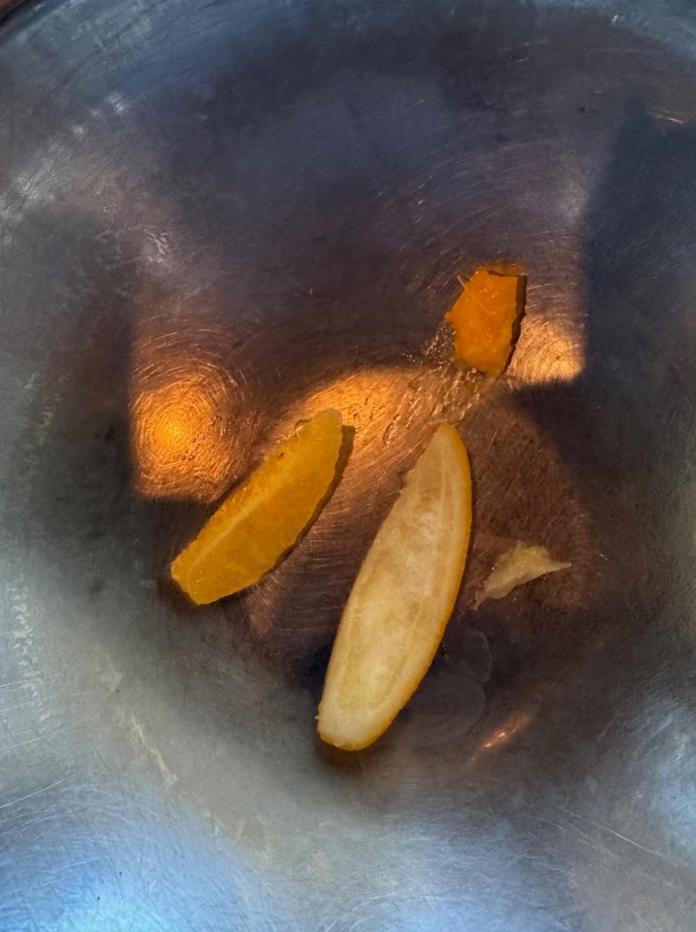 I threw away the pith and kept everything else then weighed it (1,456 grams), added equal parts sugar by weight, and blended it all in the trusty vitamix. This went through the chinois to clear any lumps and then into a bottle marked “Double Meyer.”