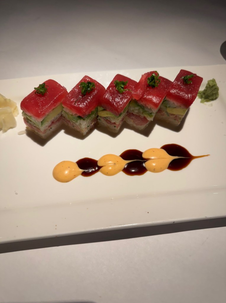 The classic spicy mayonnaise and soy reduction sauce with a toothpick through it trick for the tuna, avocado, yada yada roll. Just fine. A little difficult to eat, if that matters.